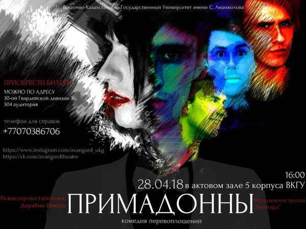 м по плану. Это не просто комедия в самом простом ее смысле. Это комедия положений. Комедия жизни. И конечно же комедия людей, попавших в самое глупейшее положение, и пытающихся найти из него выход. Помимо актеров над спектаклем трудились: Режиссер-постановщик- Дерябин Никита. Ассистент режиссера- Худяков Сергей. Звукорежиссер- Коваленко Дмитрий. Грим: Жеребненко Дарьяна, Смирнова Варвара. Костюмы- Ливицкая Алена,Эрмель Анастасия, Чистова Екатерина. Художественное решение: Баженова Дарья. ДЕЙСТВУЮЩИЕ ЛИЦА И ИСПОЛНИТЕЛИ: Лео Кларк : Бекарюков Дмитрий. Джек Гейбл: Костубаев Олжан. Маргарет Снайдер: Ливицкая Алена. Одри Мартин: Жеребненко Дарьяна. Дункан Вулли: Баженова Дарья. Доктор Джордж Майерс: Худяков Сергей. Миссис Кэтрин Майерс: Машинова Салтанат. Леди Элизабет Тремейн: Эрмель Анастасия. Амили Тремейн: Смирнова Варвара. Мэри: Чистова Екатерина. Берта Джонс: Иордан Ангелина. Матильда Аддамс: Гирш Анна. Окажутся в доме искрометной и нестареющей миллионерши мисс Флоренс Снайдер 28 апреля в 16:00 по адресу Казахстан 55 (5 административный корпус ВКГУ) Билеты можно приобрести по номерам указанным ниже (зал не резиновый, учтите :D)