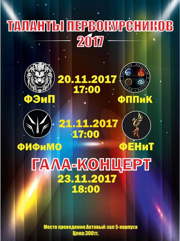 ГАЛА-КОНЦЕРТ Өткізілетін орны:С.Аманжолова атындағы ШҚМУ, Акт залы (Қазақстан, 55) Билеттері факультеттерің ЖІЖК төрағасынан алуға болады. Бағасы:300тг.