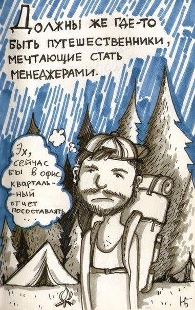 вствовать лес, воду, небо, свежий воздух. Проникаться красотой природы. Ощущать счастье. Входить в восторг. Восхищаться. Ничто так не отвлекает от городской суеты, как пеший ход по лесу. Никакие картинки и проекторы не заменят небо, полностью усыпанное звёздами. Ни в городах, ни в селах не увидеть ничего похожего. Ни одна яркая лампочка не будет так освещать, как настоящий огонь костра с такими короткими искрами и с треском горящего дерева. Тепло от костра. Ночи в палатке. Пение птиц. Голова видит, слышит, наслаждается. Она не заботится о прогрессивных делах: дедлайны, сроки, деньги, задачи, почта. Здесь этого нет. Здесь есть Ты, природа и люди рядом. Люди. А люди в походах другие. В них царит простота и счастье. Искренность и естественность. Пока они идут по лесу, среди них нет отчаянных карьеристов, поставивших цель заработать миллион или купить новый автомобиль. Пусть им останется столица, а мы посидим немного в лесу. И только вернувшись из похода, можно полностью понять удовольствие от тёплых носочков и чистой воды, наслаждение лежать под мягким пледом, пить кофе или какао и перелистывать страницы книги, погружаясь и утопая в новой истории. Только чередуя такие отдыхи, можно сполна проникаться каждым их них. Только бывая в обоих состояниях, можно жить в гармонии и с природой, и с городом. Путешествуй. Ходи. Живи.