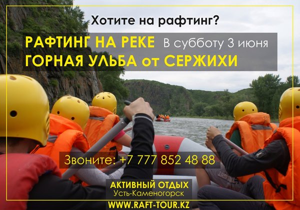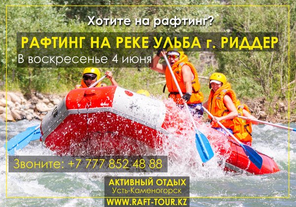 ожности – 2+ Протяженность: 25 км Время доставки: 2,5 часа Количество мест — всего 7! *** Стоимость тура: 12000 тг/чел за целый день сплава В стоимость входит : — Доставка в оба конца — Снаряжение для сплава рафт, спас.жилет, каска, весло — Услуги профессионального гида — Обед Место отъезда возле елочек на Дворце Спорта г. Усть-Каменогорск в 8:00 утра Звоните Заявки