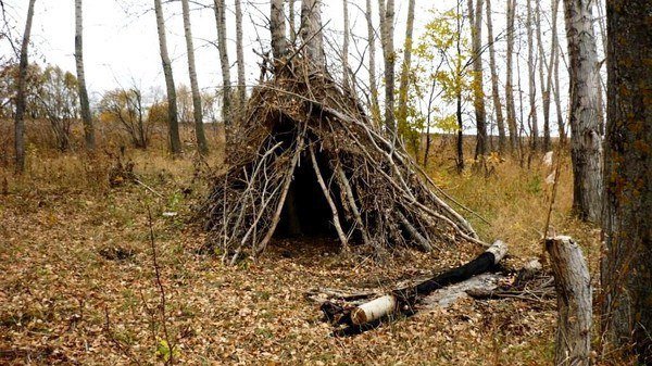 вилки ветвей (на высоте 1,5 метра) укладывается одна прочная жердь. Можно на этой стадии сделать пол (если не вся коробка набита пластилином), что бы потом не подлезать через стройки. Пол может быть из чего угодно, из ельника, соломы, и сушеных листьев. Устанавливаются наклонные стойки – так, чтобы на сучки можно было положить горизонтальный настил.