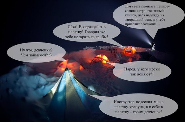 Палатка. Спальник. Чугунок. Огромный рюкзак и на чай котелок. Обед у костра. Задушевные речи. Дороги. Мозоли. Приятные встречи. И песни под звуки гитары все хором. И кажутся домом земные просторы. И сильные ноги, и крепкие плечи. И сил еще хватит на целую вечность…