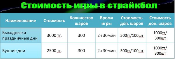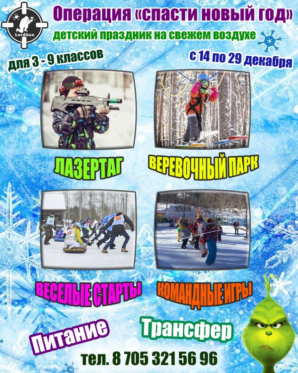 Сегодня внимание родителей всё чаще переключается на активный отдых с детьми. Мы предлагаем совместный отдых родителей и детей от 6 лет: Лазертаг; Веревочный парк; Пейнтбол; Лучный тир; Волейбол.. Так же на нашей базе есть беседки с мангалами, душевые, баня на дровах.. Наши адреса: п. Прапорщиково, ул. Мира 43/1 г. Усть-Каменогорск, пр. Сатпаева 81Б. Запись по тел.. Lordgun.kz
