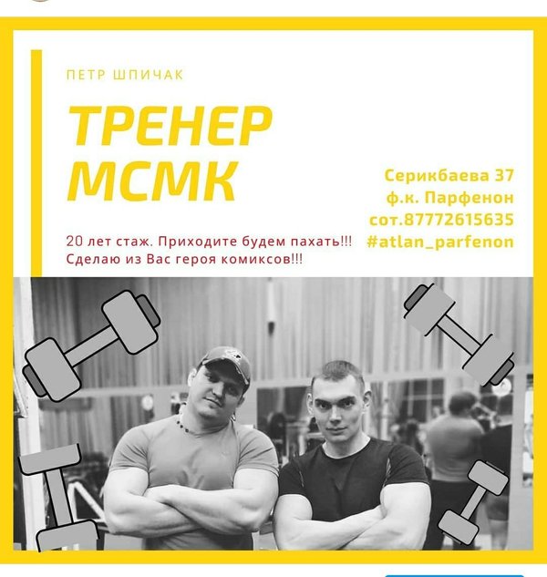 Петр Шпичак (04.06.2019): СК «Атлант» на юбилеи в Семей СК «Голд Кинг» 10 лет! Завоевали 8 золотых и 1 серебро! Приглашаем юношей и девушек в школу жима лежа, Тренировки ведут Чемпионы Казахстана Виктор и Петр Шпичак, а также Алексей Остров!