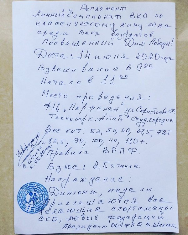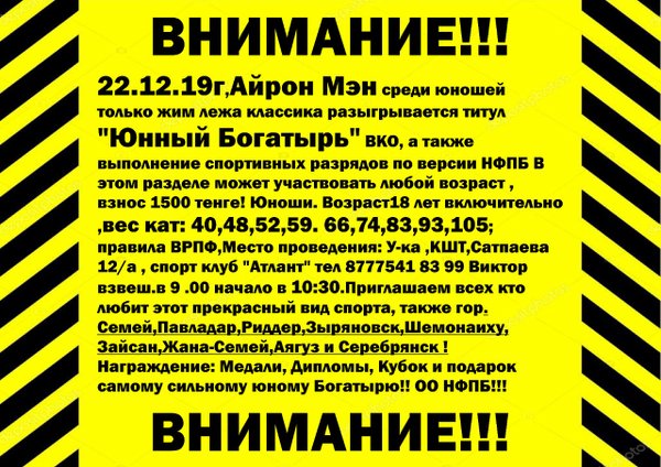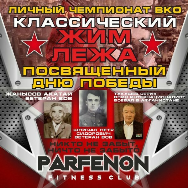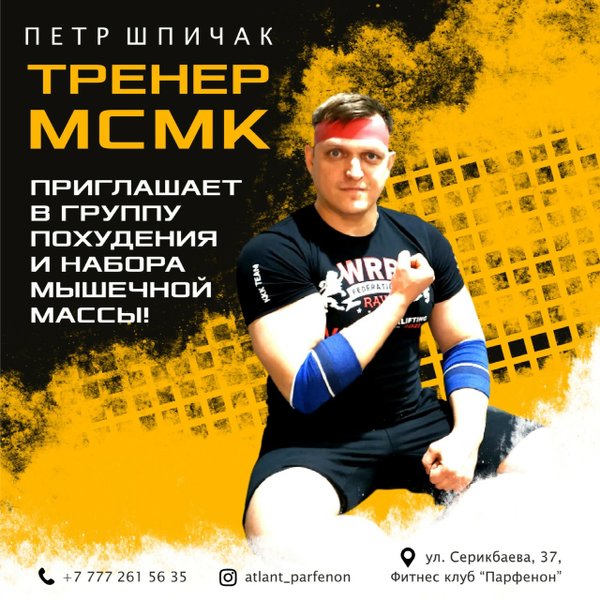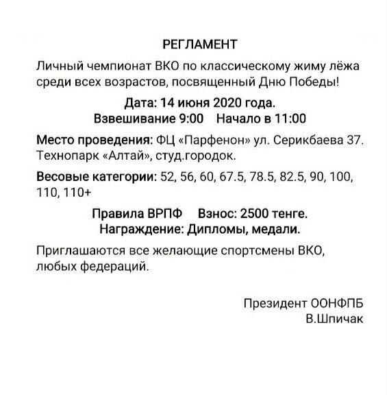 Петр Шпичак (21.07.2021): 29 августа 2021 года! ФЦ » Парфенон» личный Чемпионат восточной Азии! Классический Жим лёжа и Свободный подъём на бицепс! Весовые категории: 40,44, 48, 52, 56, 60, 67, 75, 82, 90, 100, 110, 120,120+! Возрастные группы: юноши, девочки, юниоры, девушки, мужчины, женщины, ветераны и ветеранам всех возрастов! Правила версия: ВРПФ и НФПБ. Взнос 5000 теньге! Заявки принимаются до 29 августа включительно! Телефон: Виктор!