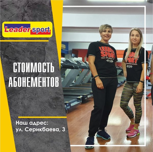 нировок. (Вт/Чт). ⠀ *СКИДКИ ДЛЯ СТУДЕНТОВ (ДО 16:00)! -Тренажерный зал (30 дней)- 5000 тг/12 тренировок. ⠀ ПЕРСОНАЛЬНЫЕ ТРЕНИРОВКИ (продолжительность 1 час): -Разовая персональная тренировка- 2500 тг; -Абонемент (30 дней) - 25.000тг/ 12 тренировок; -Абонемент 1+1 (занятия в одно время)- 35000 тг/ 12 тренировок; -Абонемент 2+1 (на усмотрение тренера)- оговаривается с тренером/ 12 тренировок; -Здоровый позвоночник- 25.000 тг/12 тренировок. ⠀ ГРУППОВЫЕ НАПРАВЛЕНИЯ: -Разовое посещение-1000 тг; -Групповые тренировки (30 дней)- 7500 тг/ 8 тренировок (с кардио 8500 тг), 8000 тг/ 12 тренировок (с кардио 9000 тг); -Айкидо- 8000 тг/12 тренировок; ⠀ *СКИДКИ ДЛЯ СТУДЕНТОВ (ДО 17:00 ВКЛЮЧИТЕЛЬНО)! Групповые тренировки (30 дней)- 7000 тг/ 12 тренировок. ⠀ НОВИНКА Безлимитный абонемент «ВСЕ ВКЛЮЧЕНО» -13.000 тг. *Полная свобода- неограниченное количество занятий в группах и в кардиозоне в тренировочные дни. ___________________________________ Наш адрес: ул. Серикбаева, 3. Телефон для справок: 54-13-49,. Ждем Вас! Ваш Фитнес клуб «Leader Sport»