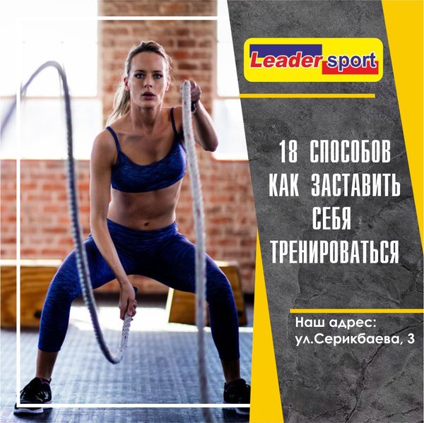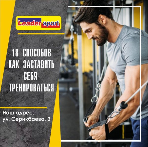 жедневно старайся улучшать результат. Только не забывай пользоваться дезодорантом! 5. Не трать время попусту Не каждый из нас может ходить в зал тогда, когда ему того хочется. Дефицит времени — распространенная проблема. Поэтому научись экономить время и старайся использовать его максимально эффективно, и тогда даже 15 минут в спортзале принесут тебе неплохие результаты. 16. Если уж покупать протеин — то сразу на год Если ты уверен, что добавки помогут тебе добиться лучших результатов — купи себе сразу годовой запас. Считай, что это инвестиция в твои будущие успехи. Теперь тебе придется качаться как минимум до тех пор, пока не закончится протеин. 17. Записывай свои результаты Если твои усилия в зале не отражаются на твоей внешности, твое желание тренироваться может сильно усохнуть. Чтобы этого не произошло, обмеряй себя каждую неделю, записывай результаты и радуйся малейшим изменениям. 18. Заключи пари Вызови кого-нибудь на небольшое фитнес-состязание. Для пущей мотивации вызови кого-то, к кому ты не испытываешь особой симпатии. __________________________________ Наш адрес: ул. Серикбаева, 3. Телефон для справок: 54-13-49,. Ждем Вас! Ваш Фитнес клуб «Leader Sport»
