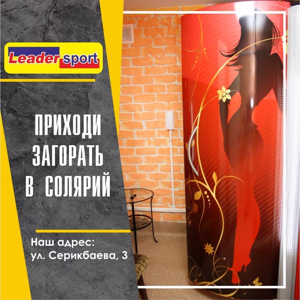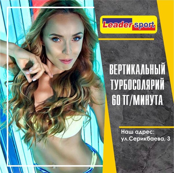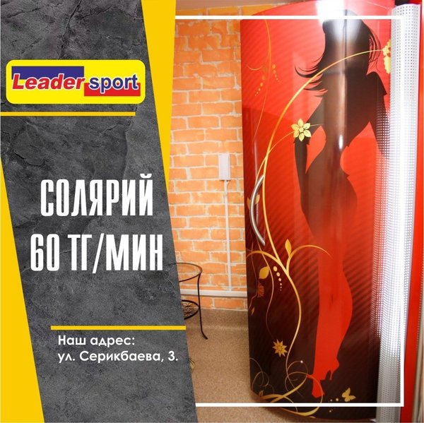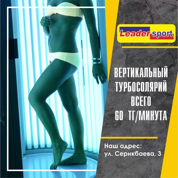 тупен в любое желаемое время, независимо от погодных явлений и сезона; Стоимость солярия (1мин.) — 60 тенге. Стикини -100 тенге. Будьте красивыми и загорелыми круглый год! Ждем вас в фитнес-клубе Leader Sport по адресу: ул.Серикбаева, 3. Записаться в солярий можно по 54-13-49,.