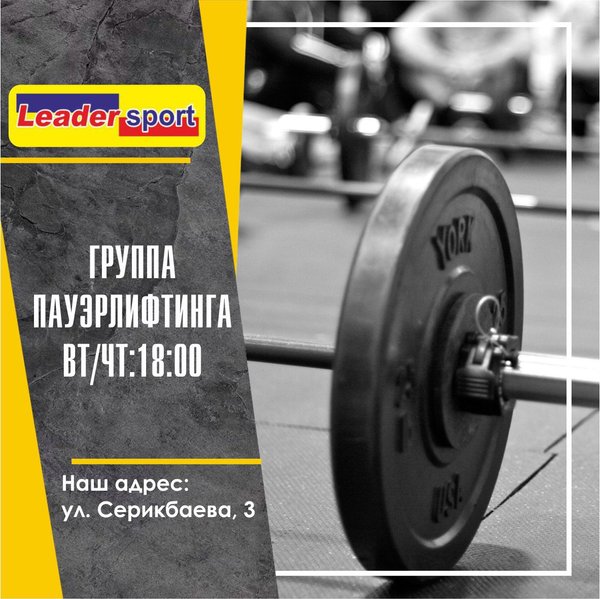 озможность спортивного роста и выполнения разрядов, а для одарённых выполнение спортивных званий, Участие в соревнованиях развивает стремление к достижению высшего результата и цели, Приходи на тренировки #ПАУЭРЛИФТИНГ Тренер: Поляков Иван. @polyakov_ivan_bear Расписание тренировок: Вт/Чт: 18:00. Стоимость: 10000 тг/ 12 тренировок. ____________________________________________ Наш адрес: ул. Серикбаева, 3. Телефон для справок: 54-13-49,. Ждем Вас! Ваш Фитнес клуб «Leader Sport»