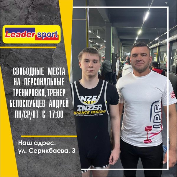 яде (чтобы разнообразить тренировочный процесс) учитывает цели человека и, исходя из этого, предлагает программу (на силу, выносливость, гибкость, рельеф или похудение, для укрепления сердца и дыхательной системы, для улучшения мышечного корсета, поддерживающего позвоночник и т. д.) повышает мотивацию В результате таких тренировок вы получаете привлекательную подтянутую фигуру, избавляетесь от комплексов, улучшаете здоровье, нормализуете рацион питания и т. д. Поэтому наши тренеры всегда с удовольствием делятся советами и желают вам отличной тренировки! Белослубцев Андрей @beloslubtsev_powerlifting -персональный тренер фитнес клуба «Leader Sport» Справки и запись по телефону: + 777 708 22 27. Стоимость- 25 000 тг/ 12 тренировок. Наш адрес: ул. Серикбаева, 3.