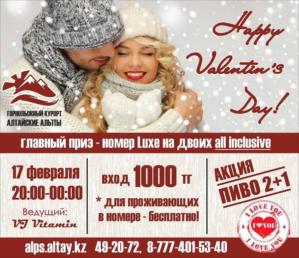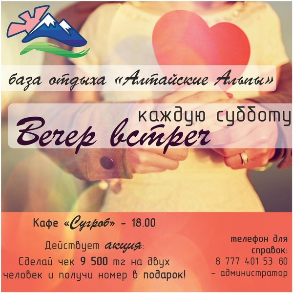 Скучно в городе? Собирай свою банду и go покорять склоны В будние дни действуют мега выгодные акции от Алтайских Альп «Десяточка» для компании от 10 человек: прокат снаряжения, Ski-pass, комплексный обед. Всего за 5 000 тенге с человека «Пятёрочка» для компании от 5 человек: прокат снаряжения, Ski-pass, комплексный обед. Всего за 7 000 тенге с человека _________________ Остались вопросы? Звони