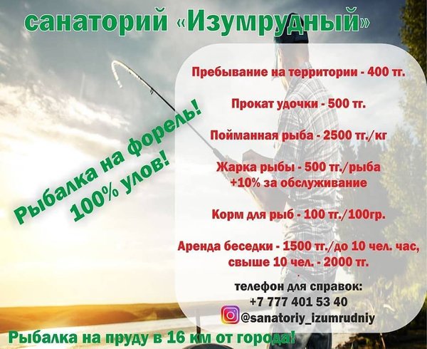 не только на лыжах и сноубордах можно зимой кататься, так же летом можно приехать на пикник и заодно порыбачить. Отдохнули от души. Теперь после такого активного отдыха нам нужен еще один день, чтобы набраться сил....ну, а как же, столько часов на ногах А вы не думайте, — » тьфу, тоже мне рыбалка!» Не тут то было! Рыба настолько уже умная, что просто так не будет клевать. По факту ничем не отличается от обычной рыбалки… Не поверите, несколько часов мы не могли поймать ни одной рыбки…Но потом удача повернулась к нам лицом и мы наконец поймали, да и кушать очень хотелось, что я сидела и просила Высшие силы:- ловись рыбка большая и маленькая.Как только поймали первые 4 рыбки, сразу отдали на готовку в #коктал, пока коптилось, мы поймали ещё 4))) Итак, если вы запланируете туда ехать, обязательно берите тёплые вещи, можно даже пледы взять,т.к. прокат пледа здесь 500 тг., после захода солнца в Горной Ульбинке очень прохладно, все таки горы))) Можно взять термос с чаем и посуду свою(нам не хватило местных чашек для чая, хорошо,что я взяла набор посуды для пикника), так же горячий чай и напитки можно купить на месте, еще говорят, там готовят Уху, но к сожалению, мы её не застали.. За 1 кг выловленной форели 3000 тг. Аренда удочек 500 тг Прикорм 200 тг Кстати, снасти можно брать свои, так же как и прикорм. Денюжку берите обязательно))) т.к. выловленную рыбу обязательно нужно выкупать… Вроде все.. Музыка: Happy Holidays Музыкант: Jef.
