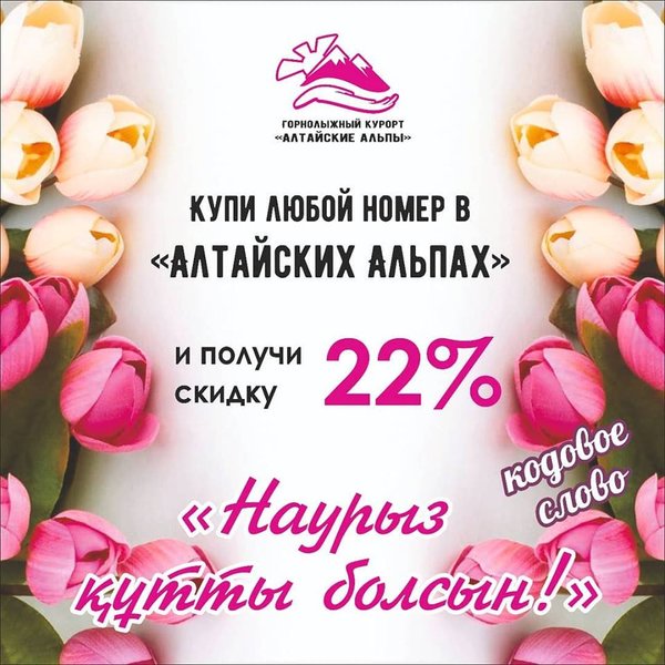 При покупке номера любой категории в Алтайских Альпах, на период с 21.03.18 по 25.03.18 назови кодовую фразу «Наурыз құтты болсын» и получи скидку 22%!!!