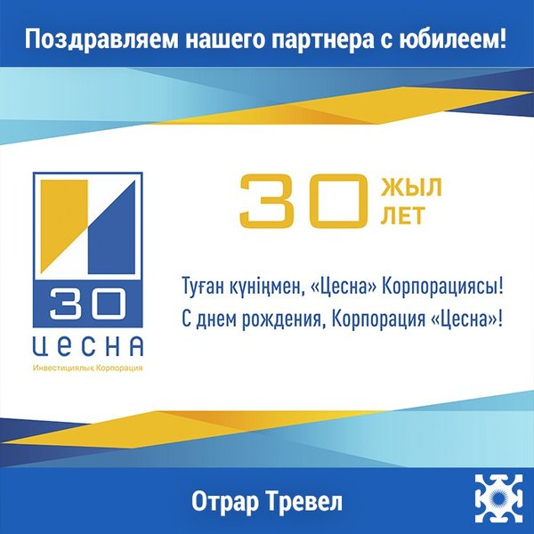 ТОО “Отрар Тревел” cердечно поздравляет коллектив АО “Корпорация “Цесна” с 30 летним юбилеем!!! Желаем, чтобы Вы развивали новые горизонты, становились ещё крепче год от года, чтобы приобретенный ценный опыт и высокие результаты работы с каждым годом были только больше и лучше! Мы считаем, что одним из условий успешного бизнеса является взаимодействие с надежными партнерами, которые благодаря своему профессионализму и стремлению к самым высоким результатам, помогают решать тяжелые задачи и, рука об руку, развиваясь и совершенствуясь, достигать… — Читать дальше
