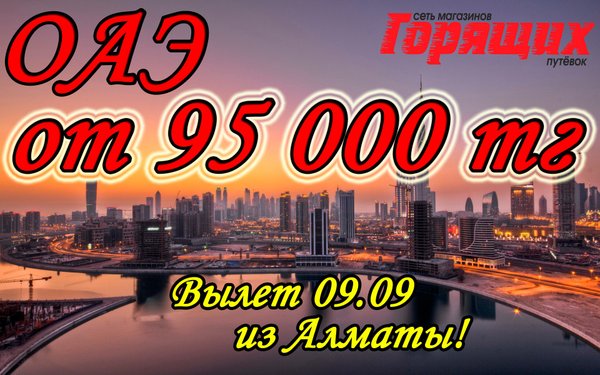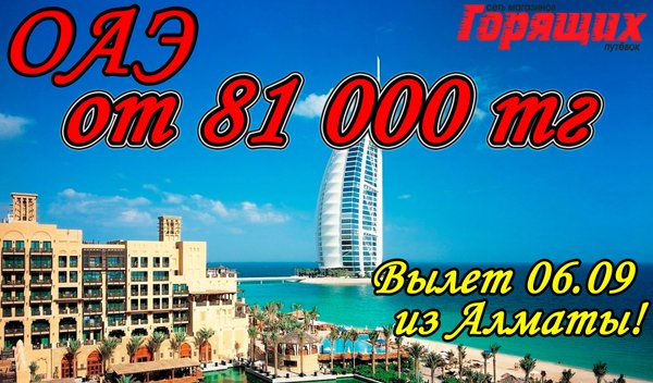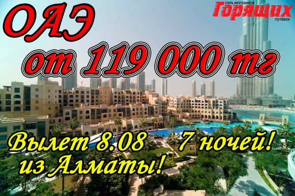 der Hotel Dubai. 3* 143 000 тг 12) Al Bustan Hotel Sharjah. 4* 144 000 тг 13) Bahi Ajman Palace 5* 148 000 тг 14) Hilton Sharjah 5* 154 000 тг 15) Miramar Al Aqah Beach Resort. 5* 160 000 тг *СТОИМОСТЬ УКАЗАНА НА 1 ЧЕЛОВЕКА ПРИ ДВУХМЕСТНОМ РАЗМЕЩЕНИИ! Дополнительно оплачивается: виза 80$ В стоимость включено: перелет, проживание в отеле, завтраки, трансфер Магазин Горящих Путевок Г. УСТЬ-КАМЕНОГОРСК ул. КАЙСЕНОВА 30а, 2 ЭТАЖ. ТЕЛ:,.