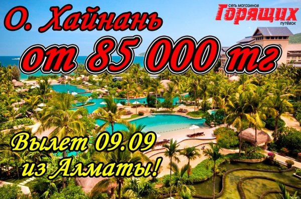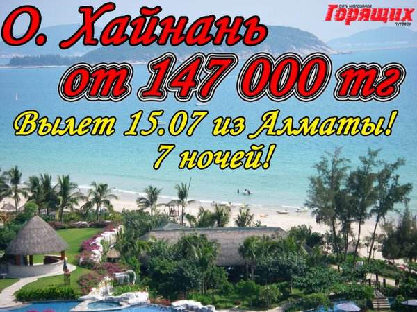 Sanya Bay 5* 225 000 тг (завтраки) 11) Intime Resort 5* 242 000 тг (завтраки) *СТОИМОСТЬ УКАЗАНА НА 1 ЧЕЛОВЕКА ПРИ ДВУХМЕСТНОМ РАЗМЕЩЕНИИ! ПРЕДЛОЖЕНИЕ ОГРАНИЧЕНО!!! В стоимость включено: перелет, проживание в отеле, указанный тип питания, трансфер Магазин Горящих Путевок г. УСТЬ-КАМЕНОГОРСК ул. КАЙСЕНОВА 30а, 2 ЭТАЖ. ТЕЛ:,.