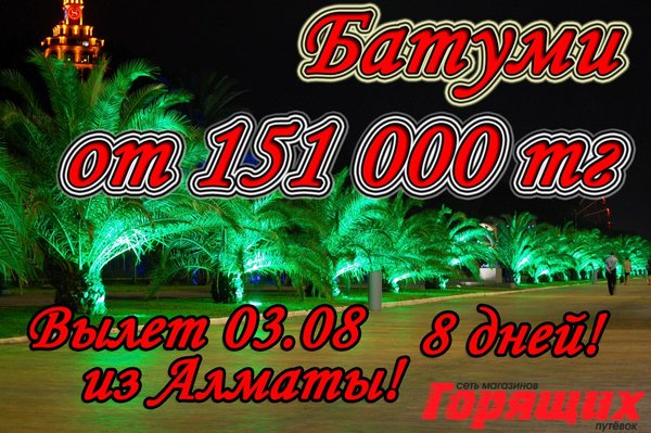 1)Intourist Palace Batumi 5* 270 000 тг (завтраки) 12) Hilton Batumi 5* 321 000 тг (завтраки) *СТОИМОСТЬ УКАЗАНА НА 1 ЧЕЛОВЕКА ПРИ ДВУХМЕСТНОМ РАЗМЕЩЕНИИ! ПРЕДЛОЖЕНИЕ ОГРАНИЧЕНО!!! В стоимость включено: перелет, проживание в отеле, указанный тип питания, трансфер Магазин Горящих Путевок г. УСТЬ-КАМЕНОГОРСК ул. КАЙСЕНОВА 30а, 2 ЭТАЖ. ТЕЛ:,.