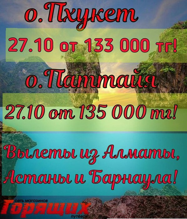 БЕРИ ПОКА ГОРИТ! о.Пхукет 27 октября от 133 000 тг из Алматы! о.Пхукет из Астаны на 10 ночей от 139 000 тг (завтраки)! о. Паттайя из Алматы 27 октября 135 000 тг на 9 ночей (без питания); 140 000 тг (завтраки)! о. Паттайя из Барнаула 4 ноября на 12 ночей от 162 000 тг (завтраки) Подарите Вашим детям незабываемые осенние каникулы! В стоимость включено: перелет, проживание в отеле, указанный тип питания, трансфер Магазин Горящих Путевок г. УСТЬ-КАМЕНОГОРСК ул. КАЙСЕНОВА 30а, 2 ЭТАЖ. ТЕЛ: 8 (7232)