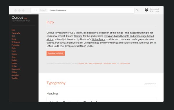 Frontend Raccoon (13.07.2016): Corpus — набор готовых CSS модулей, которые вы можете быстро пристроить в свой проект и сэкономить на вёрстке пару десятков часов. Сетка, кнопочки, анимации… Написан на Sass, легко модифицируется, хорошо задокументирован. Демо — Репозиторий — #lib@jsraccoon