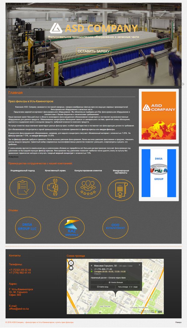 Разработка сайта для компании занимающейся реализацией промышленного фильтрационного оборудования. Компания ASD- Company занимается поставкой камерных, камерно-мембранных фильтр-прессов ведущих мировых производителей. Фильтровальное оборудование и запасные части.