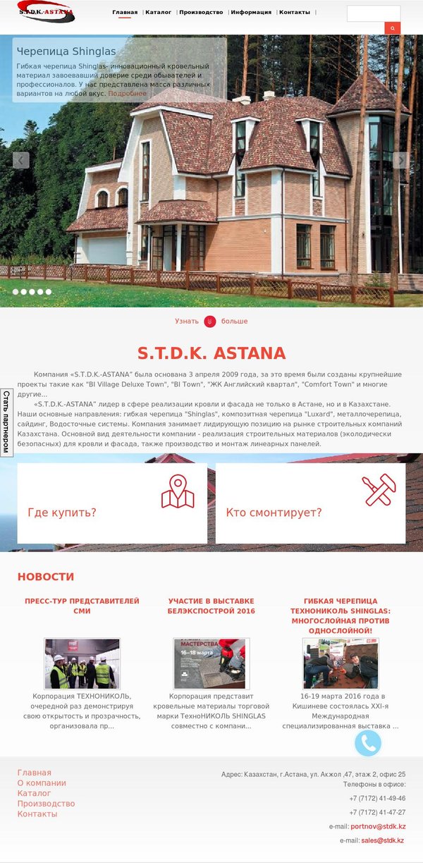 Мы разработали портал S.T.D.K. Astana. Компания занимающая лидирующую позицию на рыке строительных материалов. На сайте присутствую такие сервисы как: визуальный подбор черепицы, кровельный калькулятор. Адрес сайта: