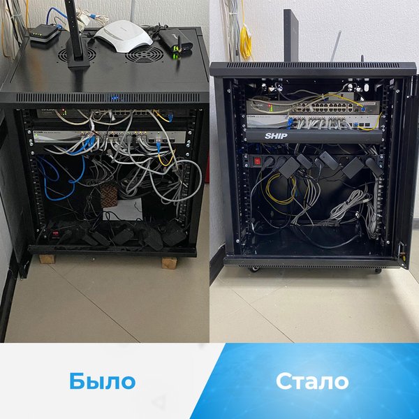 Доброе утро! Результат работы одного рабочего дня. Задачей было привести в порядок локальную сеть в офисе. «До» — всё было разбросано. «После» — всё аккуратно в навесном шкафе Toten. Плюс доустановка 8 сетевых розеток и прокладка кабеля в подвесном потолке. Другие некоторые наши работы тут -