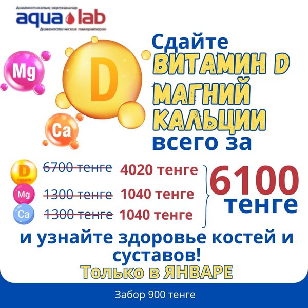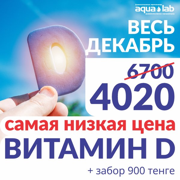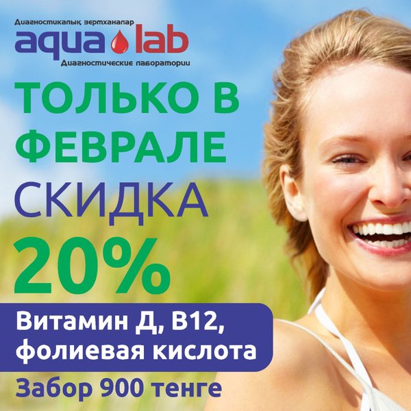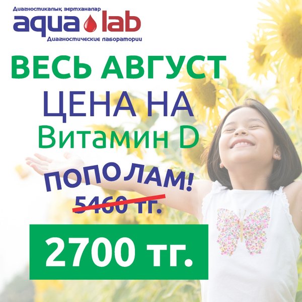 Тек тамыз айында Д дәруменіне баға жартылай 5400/2 болады Мұндай төмен баға болған емес) Тиімді ұсынысты пайдаланыңыз және денсаулығыңыз үшін маңызды талдауды жасаңыз! ____________________________________ Только в августе, цена пополам 5400/2 на Витамин Д Такой низкой цены еще не было) Воспользуйтесь выгодным предложением и сдайте важный анализ для здоровья! Во всех приемных пунктах лаборатории AQUALAB