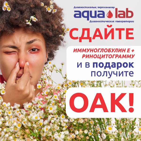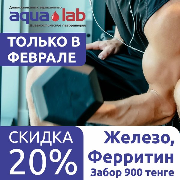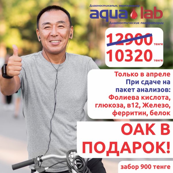 Рамазан айының аяқталуына орай Аквалаб зертханасы пакеттік ұсынысты тапсыруды ұсынады Тек 11 және 30 сәуір аралығында фолий қышқылы, В12, глюкоза, темiр, белок, ферритин пакеттік ұсынысын тапсырған кезде, ЖҚТ сыйлыққа беріледі ___________________________________________________ С окончанием месяца Рамазан, лаборатория Аквалаб предлагает сдать пакетное предложение! Только с 11 по 30 апреля при сдаче пакетного предложения фолиевая кислота, железо, белок, глюкоза, В12, ферритин, вы получаете в подарок ОАК ️ забор 900 тенге