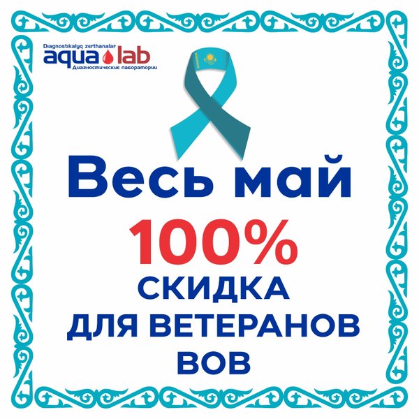 Жеңіс күніне орай AQUA LAB зертханасы Ұлы Отан соғысының ардагерлеріне 1 мамырдан 31 мамырға дейін талдаулардың барлық прайс-парақшасына 100% жеңілдік береді. Өзіңізбен бірге құжат болуы керек. ____________ В честь дня Победы, Лаборатория «AQUA LAB» предоставляет 100% скидку ветеранам ВОВ на весь прейскурант анализов с 1 по 31 мая. При себе необходимо иметь документ. Поделитесь, пожалуйста, публикацией