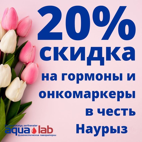 Құрметті жазылушылар, Наурыз мерекесіне орай, AQUA LAB зертханасы сізге гормондар, ісік маркерлері 20% жеңілдік туралы хабарлайды! 24—31 наурыз аралығында зертхананың барлық қабылдау пункттерінде! Деніңіз сау болсын! ____________________________________ Уважаемые подписчики, в честь праздника Наурыз, лаборатория AQUA LAB с радостью сообщает вам о 20% скидке на анализы: гормоны и онкомаркеры! С 24 по 31 марта во всех приемных пунктах лаборатории! ⠀ Будьте здоровы!