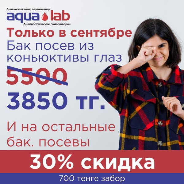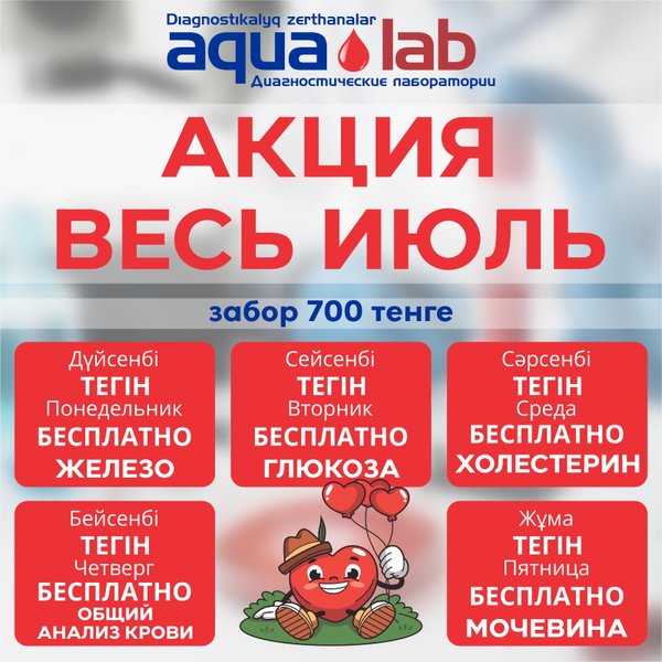Мұндай науқан әлі болған емес 1 шілдеден 31 шілдеге дейін сіз күн сайын апта күніне сәйкес бес сынақтың бірін тегін тапсыра аласыз! Бір апта ішінде денсаулығыңызды тексертіп алыңыз! Биоматериал алу бағасы 700 теңге ____________________________________ Такой акции еще не было С 1 по 31 июля, каждый день вы можете сдать бесплатно один из пяти анализов согласно дню недели! Проверьте свое здоровье за неделю! Забор биоматериала 700 тенге