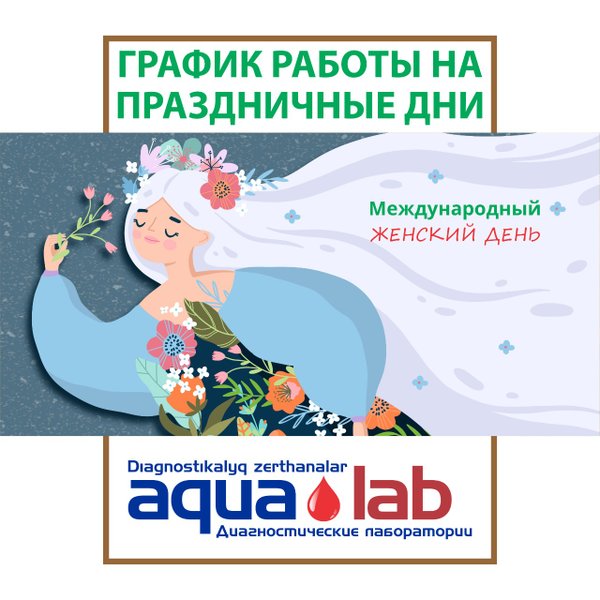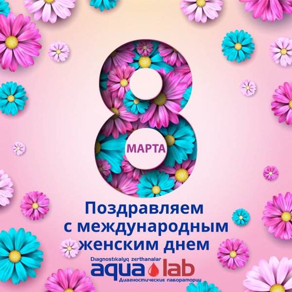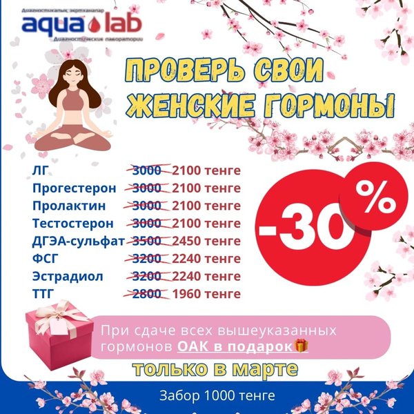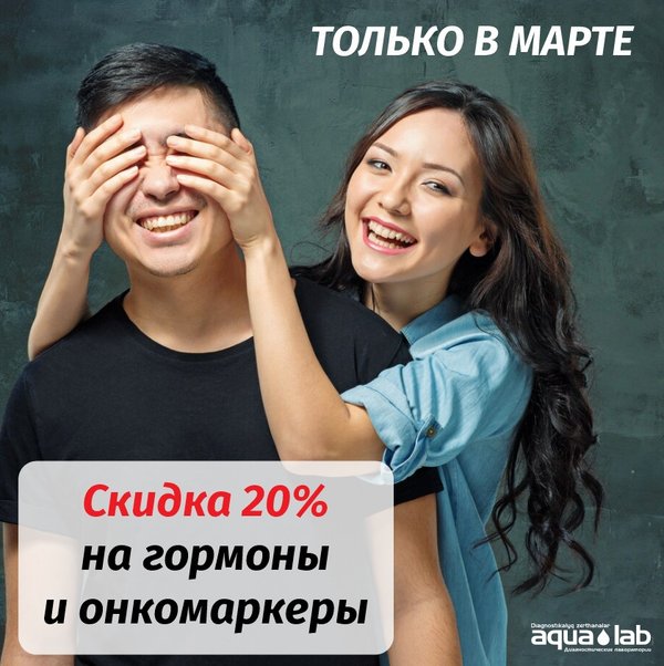 Құрметті Әйел-қыздар! 8 Наурыздың құрметіне келесі талдамаларға 20% жеңілдік береміз: гормондар, ісік маркерлері! 1⃣ наурыздан 3⃣1⃣ наурызға дейін Aqua lab зертханасының барлық пункттерінде! ____________________________________ Уважаемые наши женщины! В честь праздника 8 марта, лаборатория Аква лаб дарит 20% скидку на гормоны и онкомаркеры. С 1⃣ по 3⃣1⃣ марта в любом приемном пункте лаборатории Аква лаб вы можете сдать анализы!