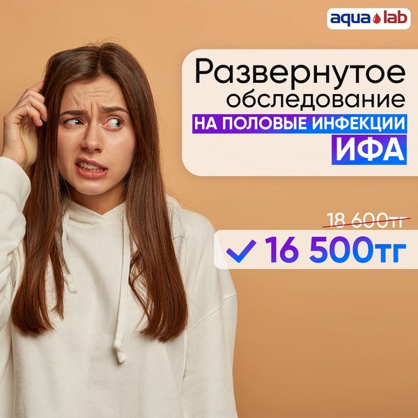 Только с 10 по 31 августа пакетное предложение «Развернутое обследование на половые инфекции» методом ИФА, ЗА 16500 тенге! В пакетное предложение входят следующие анализы: Вирус герпеса две формы (IgG/IgM) Микоплазмоз — две формы (IgG+IgM) Уреаплазмоз — две формы (IgG+IgM) Трихомониаз — две формы (IgG+IgM) Хламидиоз — две формы (IgG+IgM) Гарднереллез — две формы (IgG+IgM) Кандидоз — две формы (IgG+IgM) Сифилис Берегите себя и своих близких!