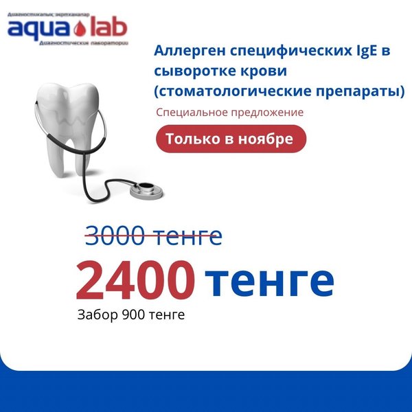 ның болуын көрсетеді. Сізге қажет: — қабылдау пунктіне келіңіз — қан тапсыру (аш қарынға) — Өзіңізбен бірге ешқандай дәрі-дәрмек алып келудің қажеті жоқ __________________________________ Проба на анестезию в стоматологии позволяет подобрать наилучший препарат для обезболивания и убедиться в том, что он не вызовет аллергии. Это необходимо при наличии диагностированной аллергии, жалоб и актуально для длительного процесса лечения. Для выявления негативной реакции на анестетики проводится аллергопроба. Диагностика позволяет определить реакцию организма на медицинские препараты. Это предполагает забор крови из вены и анализ уровня иммуноглобулинов в крови. В ходе исследования определяется общий уровень IgE. Повышенные показатели говорят о наличии аллергической реакции. Вам необходимо: — прийти приемный пункт — сдать кровь (натощак) — с собой не надо приносить ни какой препарат. Стоимость анализа 2000 тенге Забор 700 тенге