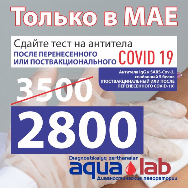 бходимости ревакцинации, то Вам необходимо сдать кровь из вены в любом пункте лаборатории AQUALAB. При выполнении SARS -CoV-2-S (количественный) вы узнаете истинный уровень защиты организма от повторного заражения SARS-CoV-2! Важно! Все результаты лабораторных тестов, значения которых выражены в СОЕ, y.e, КП (коэффициент позитивности) — являются качественными методами, позволяющими определить наличие, либо отсутствие антител и гуморального иммунитета. — Забор биоматериала — 500 тенге.