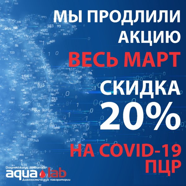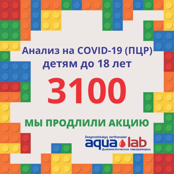 По многочисленной просьбе постоянных клиентов, мы запускаем акцию для наших маленьких клиентов! СПЕЦИАЛЬНАЯ ЦЕНА В ОКТЯБРЕ МЕСЯЦЕ НА ПЦР — ТЕСТ COVID -19 — 3100 ТЕНГЕ По акции могут сдать дети до 18 лет! Стоимость забора биоматериала — 500 тенге! Акция действует во всех приемных пунктах лаборатории AQUALAB где ведётся забор биоматериала на COVID 19!! Телефон для справок: COVID WhatsApp