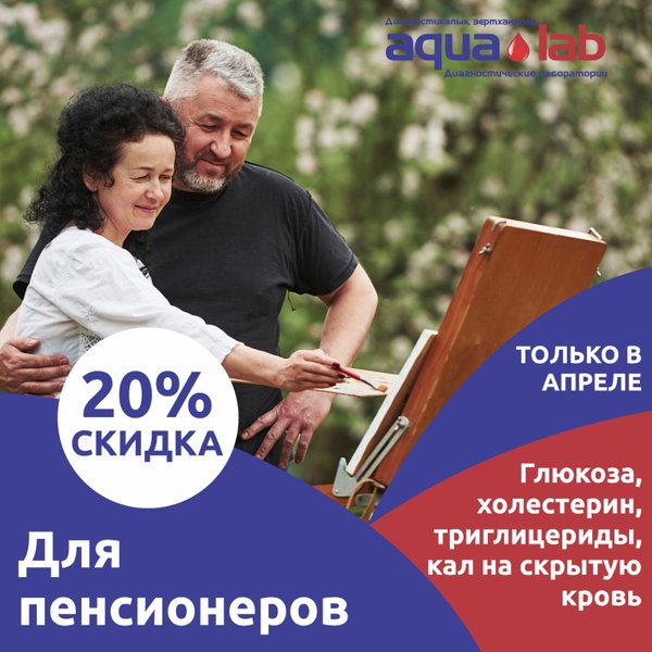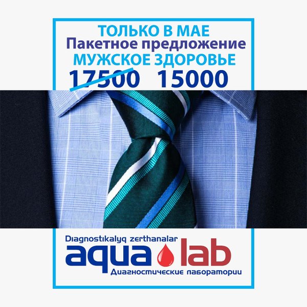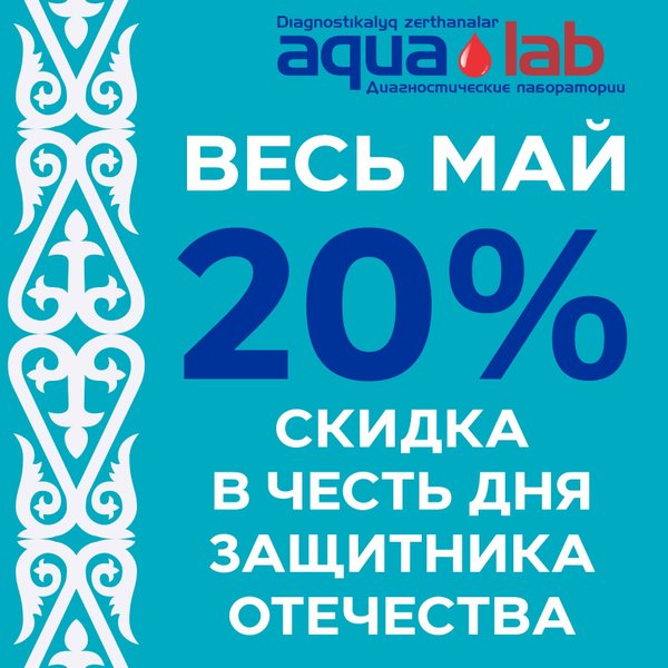 Отан қорғаушылар күніне байланысты AQUA LAB зертханасы 1⃣8⃣ жастан асқан ер адамдарға 20% жеңілдік береді. 7—31 мамыр аралығында барлық қабылдау пункттерінде «AQUA LAB» ___________________________________ В связи с днем защитника Отечества, Лаборатория «AQUA LAB» дарит 20% скидку мужчинам с 1⃣8⃣ лет. С 7 по 31 мая во всех приемных пунктах лаборатории «AQUA LAB»