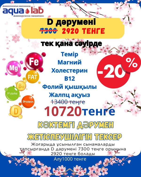 Проверьте здоровье весной – восполните дефициты! Сдайте анализы с 20% скидкой на: Железо Магний Холестерин В12 Фолиевую кислоту Общий белок И получите 60% скидку на: Витамин D Всего за 2920₸ вместо 7300₸ – только в апреле! При сдаче вышеуказанных анализов! Будьте уверены в своем здоровье этой весной!