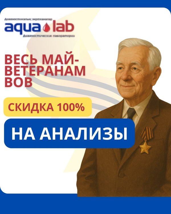 Жеңіс күніне орай AQUA LAB зертханасы Ұлы Отан соғысының ардагерлеріне 7 мамырдан 31 мамырға дейін талдаулардың барлық прайс-парақшасына 100% жеңілдік береді. Өзіңізбен бірге құжат болуы керек. ____________________________________ В честь дня Победы, 9 мая, Лаборатория «AQUA LAB» предоставляет 100% скидку ветеранам ВОВ на весь прейскурант анализов с 7 по 31 мая. При себе необходимо иметь документ.