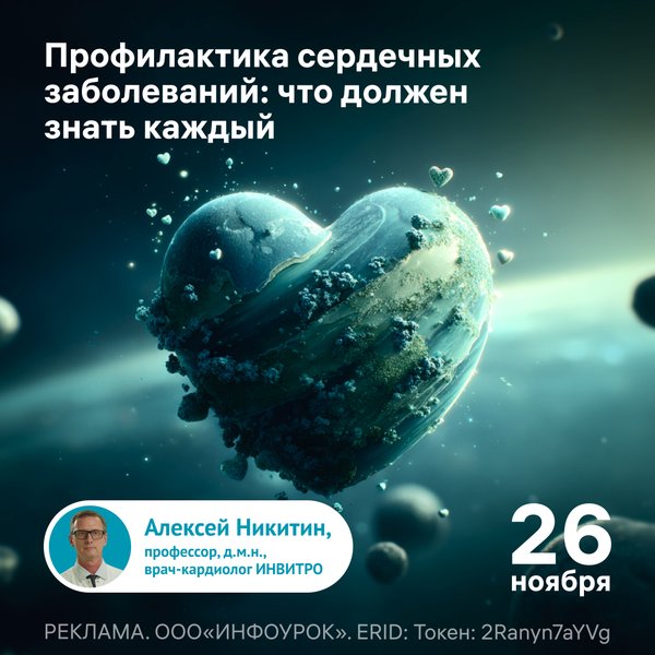 Erid: 2Ranyn7aYVg Мы продолжаем спецпроект «Здоровье» совместно с образовательным маркетплейсом «Инфоурок»: Каждый месяц наши врачи делятся знаниями в формате вебинаров — просто, понятно и с практическими советами. Мы уже говорили о головной боли напряжения, сезонных заболеваниях, как справляться с хронической усталостью и как сохранить голос педагога. ️А 26 ноября в 17:00 (МСК) приглашаем вас на новый вебинар: «Профилактика сердечных заболеваний: что должен знать каждый. Консультация врача‑кардиолога». Спикер: Алексей Никитин, доктор медицинс… — Читать дальше