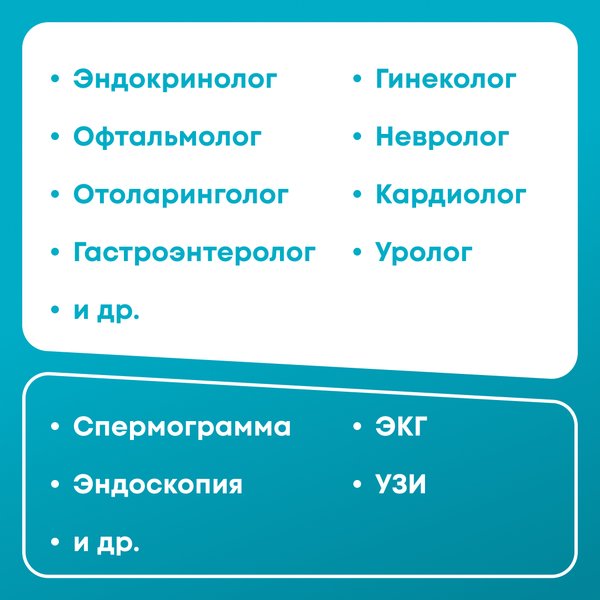 Терапевт, гинеколог, эндокринолог, маммолог, невролог, цефалголог, гастроэнтеролог, флеболог и другие специалисты