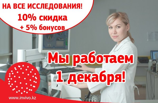 Уважаемые пациенты! Поздравляем Вас с днем Первого Президента! В этот день пациенты получают скидку 10% на ВСЕ исследования + 5% бонусов. Акция распространяется на МРТ, КТ, Видеоэндоскопию. Подробнее -> #Инвиво. С заботой о вашем #Здоровье. ------------------------------------------------------------------- Құрметті емделушілер! Сіздерді Тұңғыш Президент күнімен құттықтаймыз! Бұл күні емделушілер БАРЛЫҚ зерттеулерге 10% жеңілдікті + 5% бонустарды алады. Толығырақ Инвиво. Сіздің денсаулығыңызға деген қамқорлықпен
