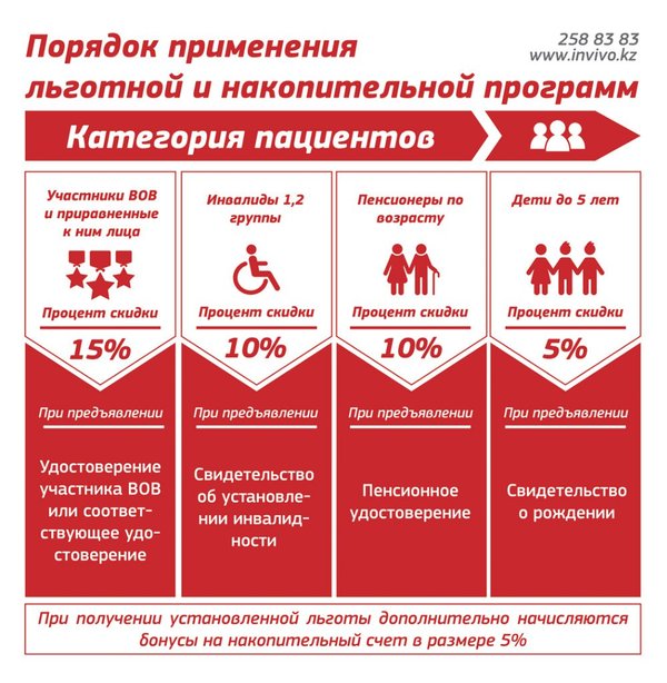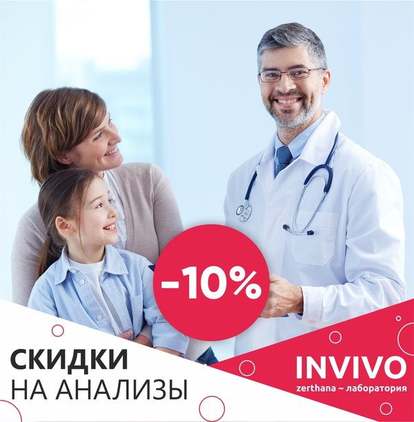 Друзья! Напоминаем что у нас действуют льготы на все анализы (включая COVID-19). Пенсионерам и Инвалидам -10% Детям -5%; А так же, в связи с пандемией, мы ввели скидку для всех врачей -10% __ INVIVO — сеть лабораторий в Казахстане — 5% бонусов на накопительную карту -10% скидки при оплате банковской картой на сайте