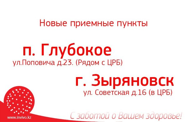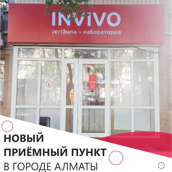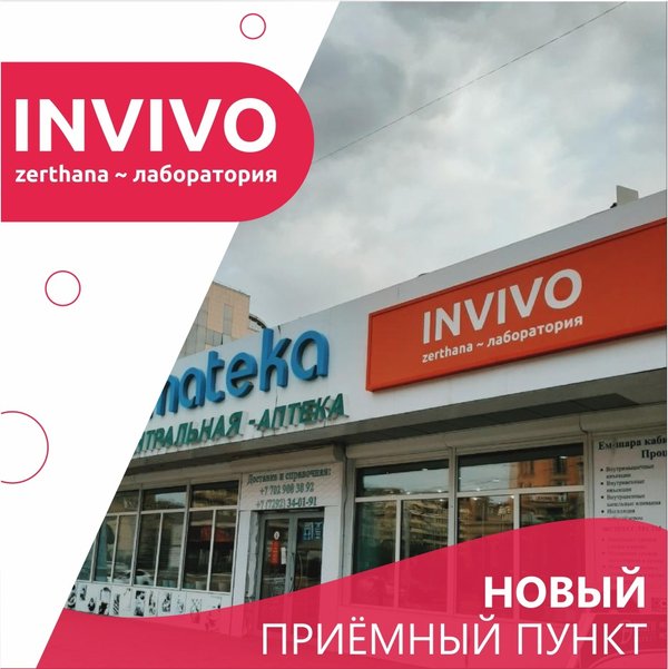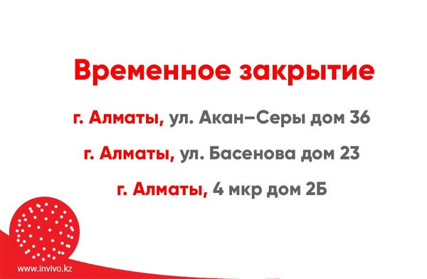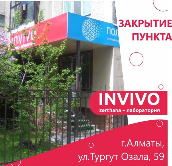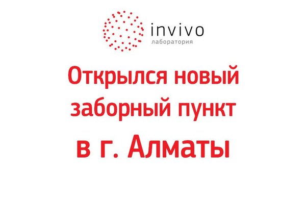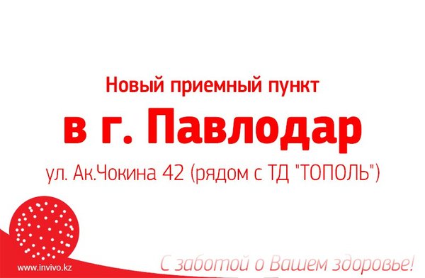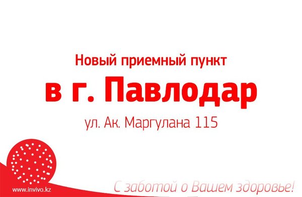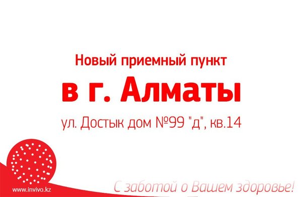 Уважаемые пациенты и партнеры! Временно закрыты приемные пункты Лаборатории INVIVO в г. #Алматы: Адрес: ул. Акан-Серы д. 36 Адрес: ул. Басенова д. 23 Адрес: мкр. 4 д. 2Б Информацию о переезде данных пунктов мы опубликуем на сайте, следите за обновлениями. Подробнее -> Инвиво. С заботой о вашем здоровье.