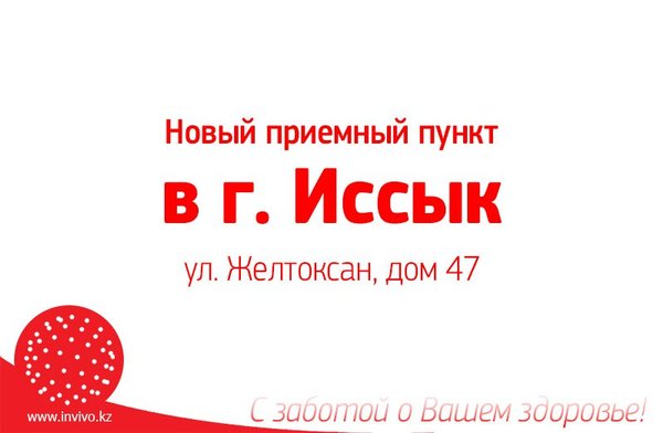 рып, талдауды тапсыру, өз денсаулығыңыздың жағдайын бақылау енді әлдеқайда ыңғайлы! Қабылдау пункті туралы толық ақпарат: Инвиво. Сіздің денсаулығыңызға деген қамқорлықпен