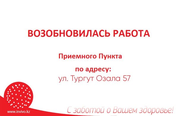 Уважаемые пациенты и партнеры! Информируем Вас о том, что лаборатория INVIVO возобновляет работу Приемного Пункта в г. #Алматы по адресу ул. Тургут Озала д. 57 Подробнее -> *Напоминаем, что большинство исследований сдается на тощак до 11:00 #Инвиво. С заботой о Вашем