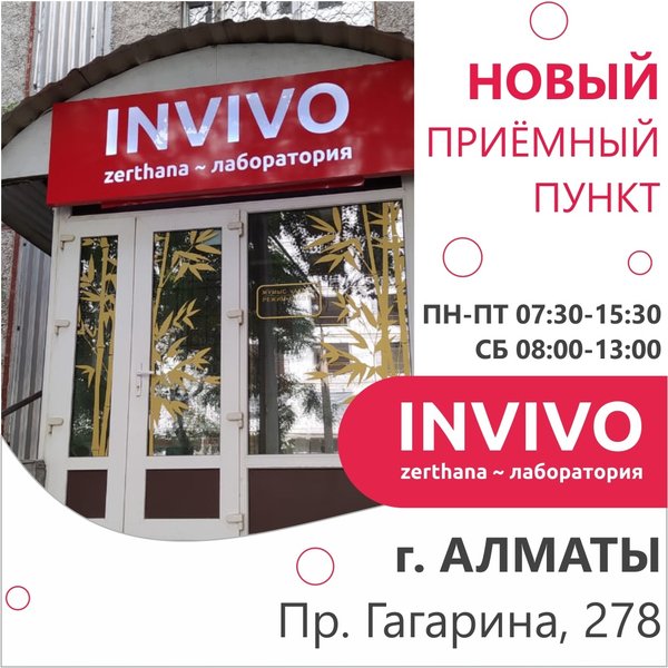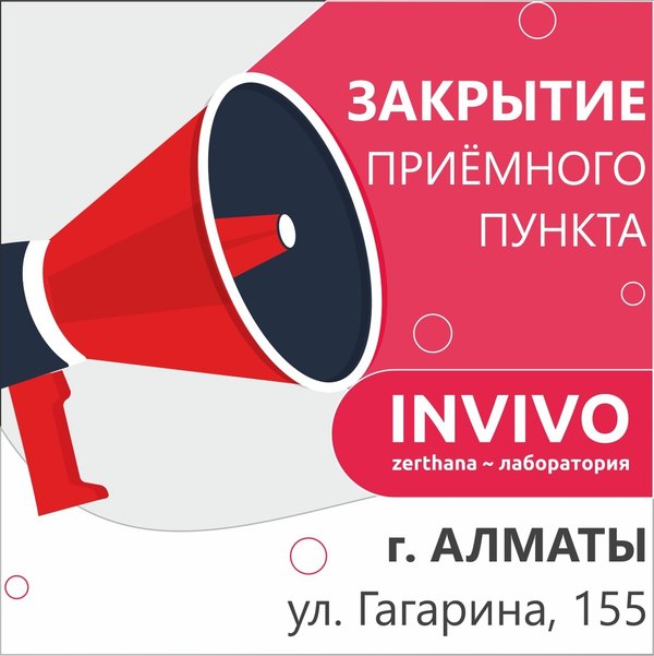 Друзья! Сообщаем о закрытии приёмного пункта по адресу: г. Алматы, ул.Гагарина, 155. Остальные пункты работают в обычном режиме. __ INVIVO — сеть лабораторий в Казахстане — 5% бонусов на накопительную карту