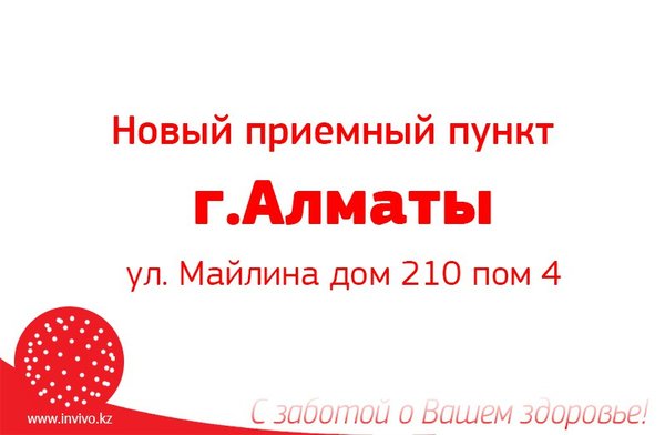 у нәтижелерін ала отырып, талдауды тапсыру, өз денсаулығыңыздың жағдайын бақылау енді әлдеқайда ыңғайлы! Қабылдау пункті туралы толық ақпарат: Мекенжайы: Достық даңғылы 99 «д» үй, 14 пәтер (Әль-Фараби көшесінен жоғары) Инвиво. Сіздің денсаулығыңызға деген қамқорлықпен