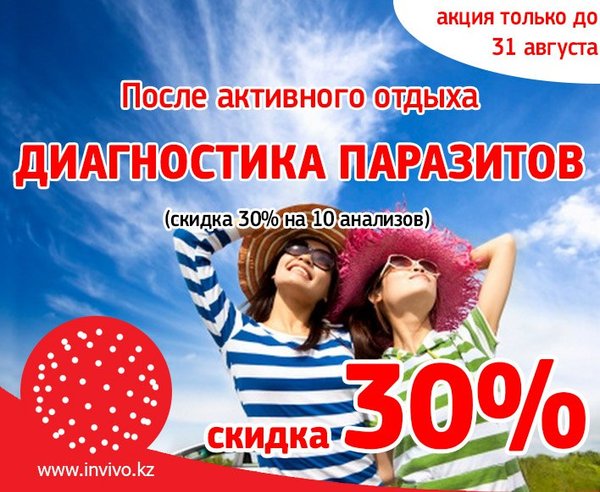зон. Ознакомиться со списком исследований по специальной цене (- 30%) можно на сайте: Выберите и пройдите исследования в списке, при необходимости проконсультируйтесь с врачом. Берегите свое #здоровье. ------------------------------------------------------------------- Инвивомен жаз бойы сау бол! Теңіз, жағажай, саябақта көкке шығу, табиғатта спортпен айналысу бұның бәрі жаз үшін жаралғандай. Бәріміз де демалуды ұнатамыз, әсіресе осы мезгілде. Бірақ кейде құрт-құмырсқалардан арнаулы қорғаныш заттарды пайдалануды ұмытамыз, жаңа және таныс емес жерлерде шомылып тамақ ішеміз және т.б. Сөйтіп, біздің ағзамыз күйзелуге ұшырайды және кейде түрлі паразиттерге тап болады. Сіздің денсаулығыңызға деген қамқорлықпен, біз осы мезгілде жиі кездесетін паразиттерді табуға көмектесетін 10 зерттеуге арнаулы бағаны жасадық. Арнаулы баға бойынша (-30%) зерттеулер тізімімен сайттан таныса аласыз: Тізімдегі зерттеулерді таңдап, өтіңіз, қажет болса дәрігерден кеңес алыңыз. Өз денсаулығыңызды