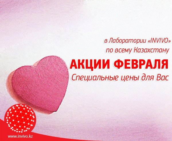 еров как по отдельности, так и в составе специально разработанных пакетов исследований: Цитологическое исследование шейки матки, Онкологическое обследование для женщин, Онкологическое обследование для мужчин и другие. В этой связи, весь февраль Лаборатория INVIVO предоставляет скидку 15% на пакет исследований Онкологическое обследование для мужчин. Кроме того, 4 февраля мы начнем розыгрыш 2-х пакетов в социальной сети Facebook. Подробнее -> #Инвиво. С заботой о вашем #Здоровье. ------------------------------------------------------------------- 4 ақпанда Қатерлі ісікке қарсы дүниежүзілік күрес күні аталып өтіледі Ақпан бойы INVIVO зертханасы Ер адамдарға арналған онкологиялық тексеру пакетіне 15%-дық жеңілдікті ұсынады. 4 ақпанда бүкіл әлемде, соның ішінде Қазақстанда, Дүниежүзілік қатерлі ісік ауруларымен күрес күні аталып өтіледі. Осы халықаралық күннің мақсаты заманауи өркениеттің ең қауіпті аурулардың бірі ретінде қатерлі ісік туралы хабардар болу, осы ауруды болдырмау, анықтау және емдеуге назарын аудару. Біздің зертханамызда сіз онкомаркерлердің барлық түрлеріне жеке, сондай-ақ арнайы құрылған зерттеулер пакетінің құрамында талдауды тапсыра аласыз: Жатыр мойыншығының цитологиялық зерттеуі, Әйел адамдарға арналған онкологиялық тексеру, Ер адамдарға арналған онкологиялық тексеру және басқалар. Осыған байланысты,INVIVO зертханасы ақпан бойы Ер адамдарға арналған онкологиялық тексеру зерттеулер пакетіне 15%-дық жеңілдікті ұсынады. Сонымен қатар, 4 ақпанда Facebook әлеуметтік желісінде 2 пакеттің ұтыс ойынын бастаймыз. Толығырақ -> Инвиво. Сіздің денсаулығыңызға деген қамқорлықпен.